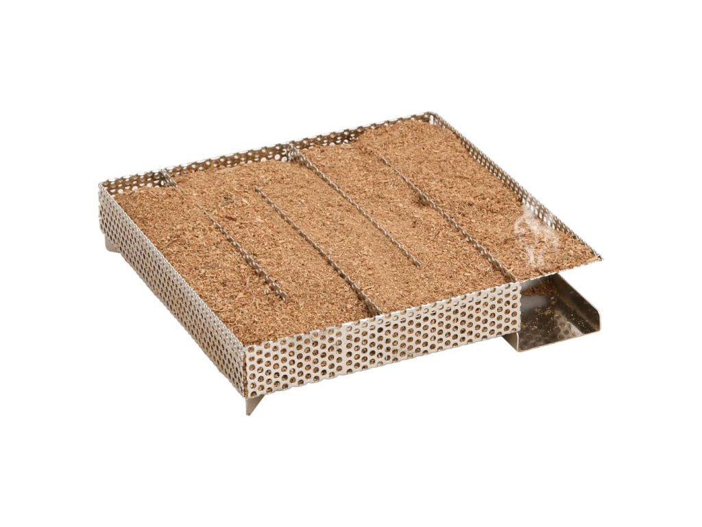 - Snadné použití: Stačí naplnit pilinami a zapálit čajovou svíčkou, dokud piliny nezačnou měnit barvu. Vyjměte čajovou svíčku a vložte generátor do udírny. Kompaktní čtvercová mřížka umožňuje rovnoměrné a pomalé hoření štěpků po dobu až 12 hodin.