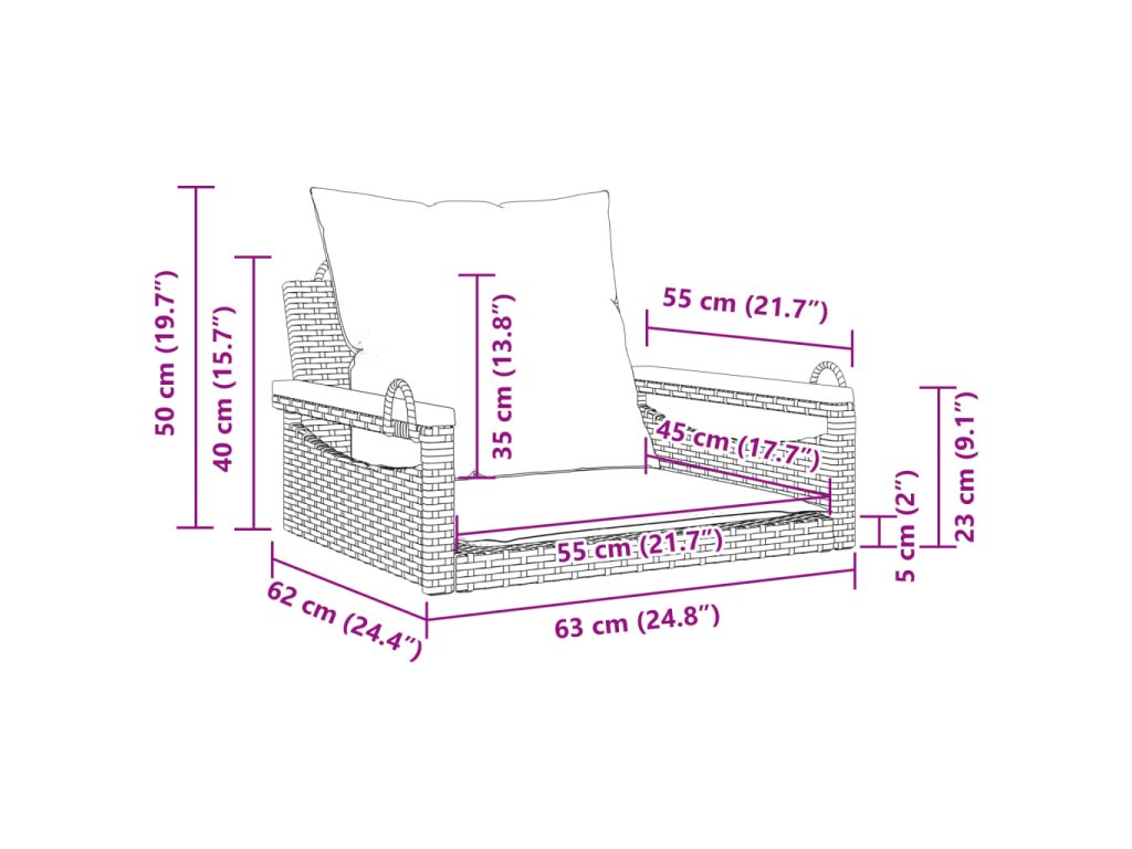 Houpací lavice s poduškami šedá 63 x 62 x 40 cm polyratan 368165
