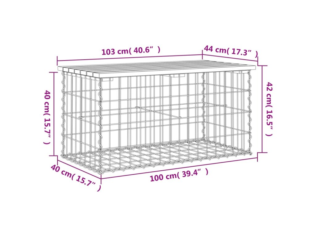 - Robustní a stabilní základna: Tato venkovní lavice je vybavena základnou z pozinkovaného ocelového gabionového koše, který je navržen tak, aby jej bylo možné naplnit kameny a štěrkem pro atraktivnější vzhled. Mřížku gabionového koše tvoří podélné a svislé drátky, které jsou navíc v každém spoji svařené pro lepší stabilitu.