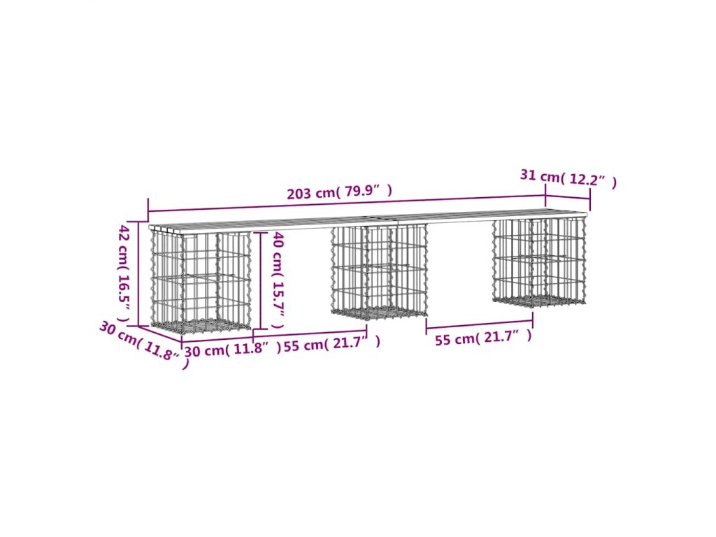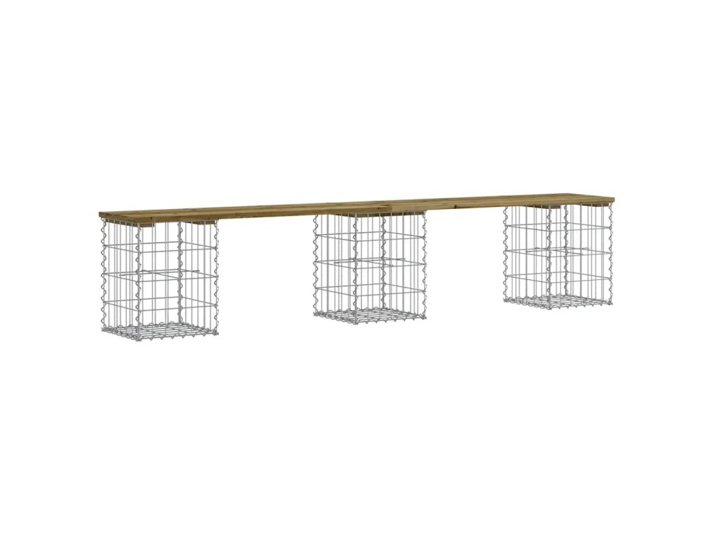 - Robustní a stabilní základna: Tato venkovní lavice je vybavena základnou z pozinkovaného ocelového gabionového koše, který je navržen tak, aby jej bylo možné naplnit kameny a štěrkem pro atraktivnější vzhled. Mřížku gabionového koše tvoří podélné a svislé drátky, které jsou navíc v každém spoji svařené pro lepší stabilitu.