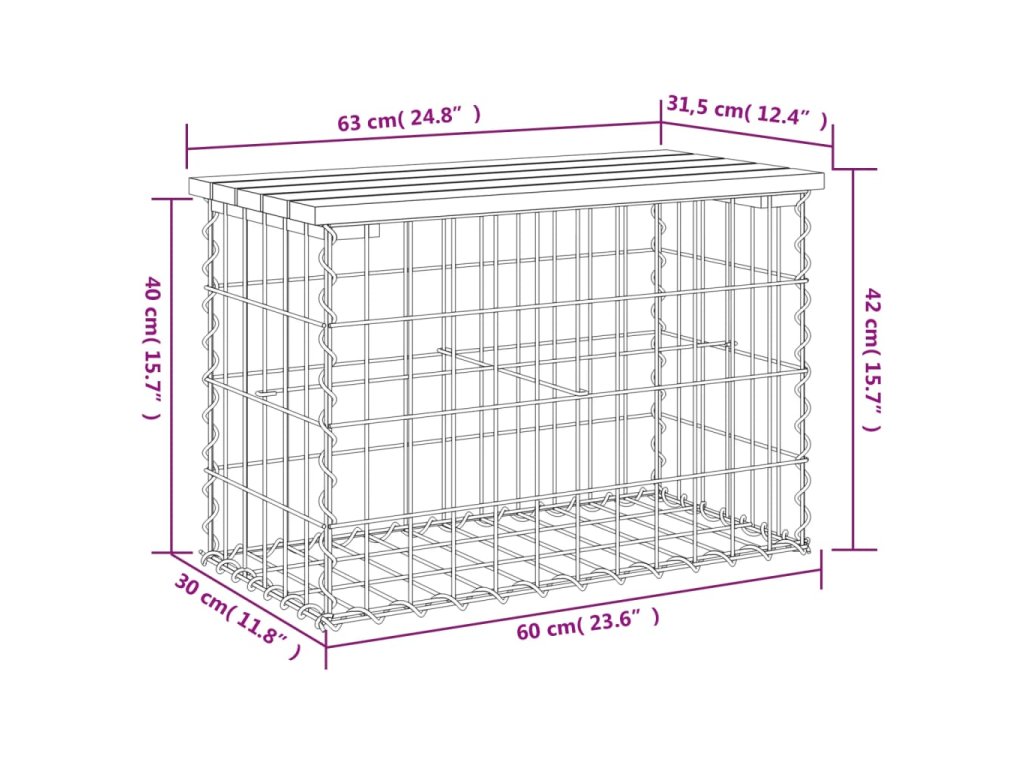 - Robustní a stabilní základna: Tato venkovní lavice je vybavena základnou z pozinkovaného ocelového gabionového koše, který je navržen tak, aby jej bylo možné naplnit kameny a štěrkem pro atraktivnější vzhled. Mřížku gabionového koše tvoří podélné a svislé drátky, které jsou navíc v každém spoji svařené pro lepší stabilitu.
