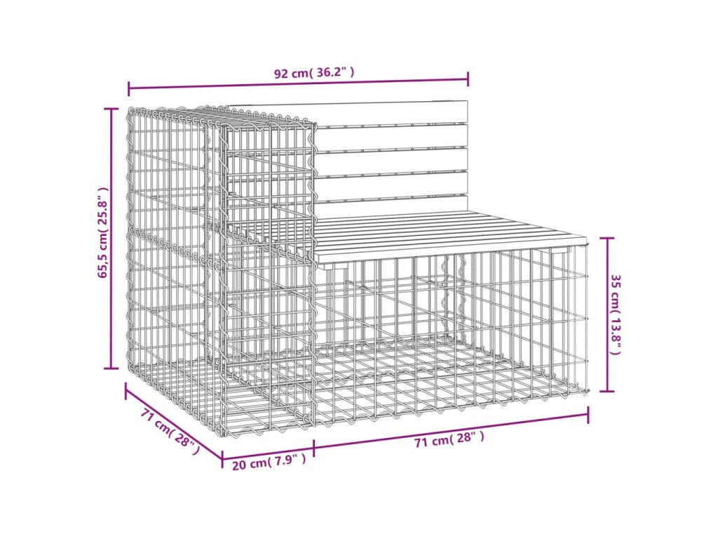 - Robustní a stabilní základna: Tato venkovní lavice je vybavena základnou z pozinkovaného ocelového gabionového koše, který je navržen tak, aby jej bylo možné naplnit kameny a štěrkem pro atraktivnější vzhled. Mřížku gabionového koše tvoří podélné a svislé drátky, které jsou navíc v každém spoji svařené pro lepší stabilitu.