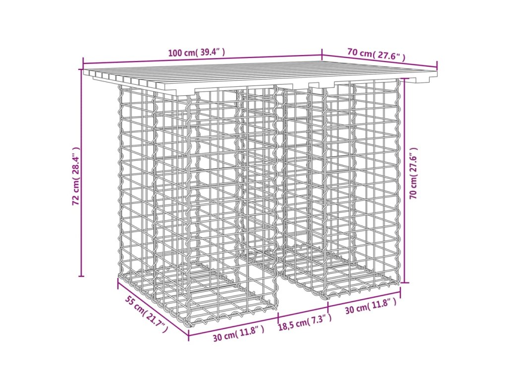 - Pevná a stabilní základna: Tento venkovní stůl má základnu z pozinkovaného ocelového gabionu, který je navržen tak, aby se dal pro větší krásu naplnit kameny a štěrkem. Pletivo gabionového koše je v každém průsečíku svařeno příčnými a podélnými dráty pro větší stabilitu.