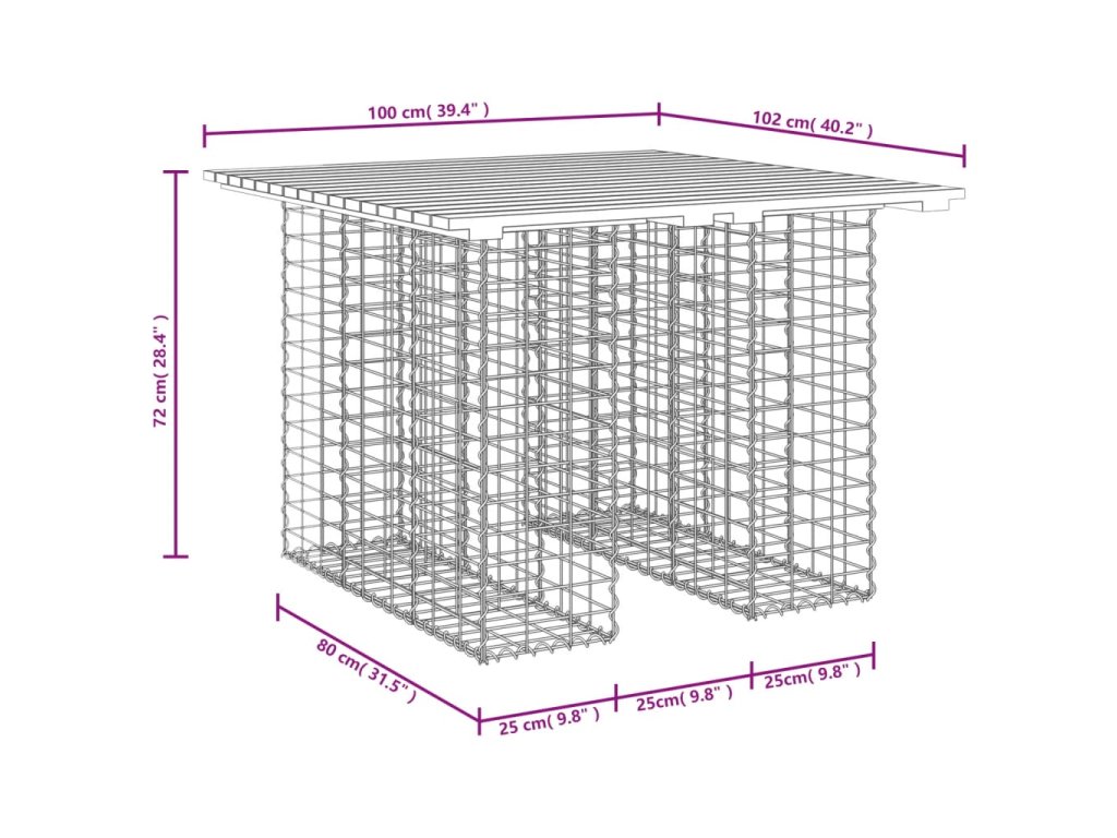 - Pevná a stabilní základna: Tento venkovní stůl má základnu z pozinkovaného ocelového gabionu, který je navržen tak, aby se dal pro větší krásu naplnit kameny a štěrkem. Pletivo gabionového koše je v každém průsečíku svařeno příčnými a podélnými dráty pro větší stabilitu.