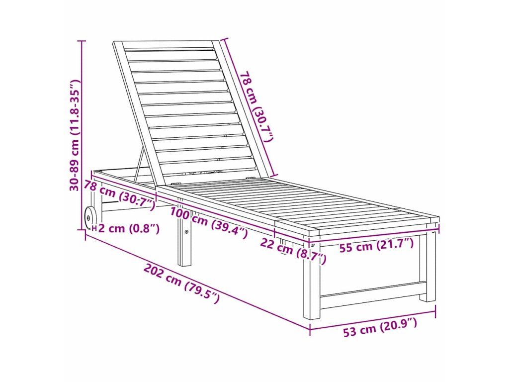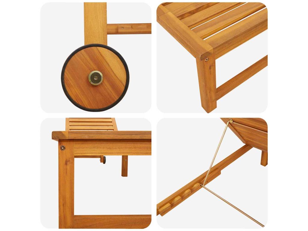 - Materiály: Vyrobeno z masivního akáciového dřeva, tohle lehátko je silné a spolehlivé. Akácie je odolná a zvládne jakékoli počasí, což je ideální pro venkovní nábytek. Nejenže dělá lehátko pevné, ale přidává i přírodní kouzlo do zahrady nebo na terasu. Dřevo má krásnou texturu, která se skvěle hodí k přírodě.