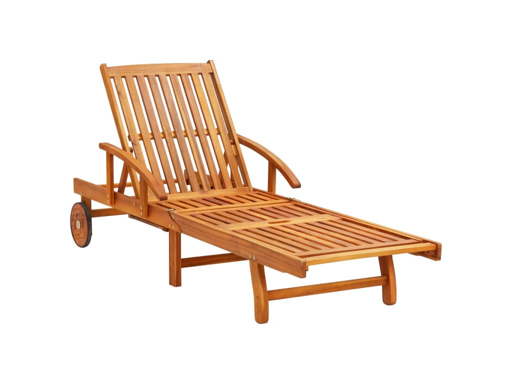 Zahradní lehátko je vyrobené z masivního akáciového dřeva a dobře odolává povětrnostním vlivům, má dlouhou životnost a je vhodné pro venkovní použití. Je vybavené kolečky, takže ho snadno přesunete, kam potřebujete. Opěradlo a opěrka nohou, které jsou nastavitelné od zcela vzpřímeného sedu až po vodorovnou polohu vleže, vám poskytnou maximální pohodlí. Když je nepoužíváte, lze lehátko i stolek složit. Přiložená poduška není pouze praktickým doplňkem, ale má také dekorativní funkci.
