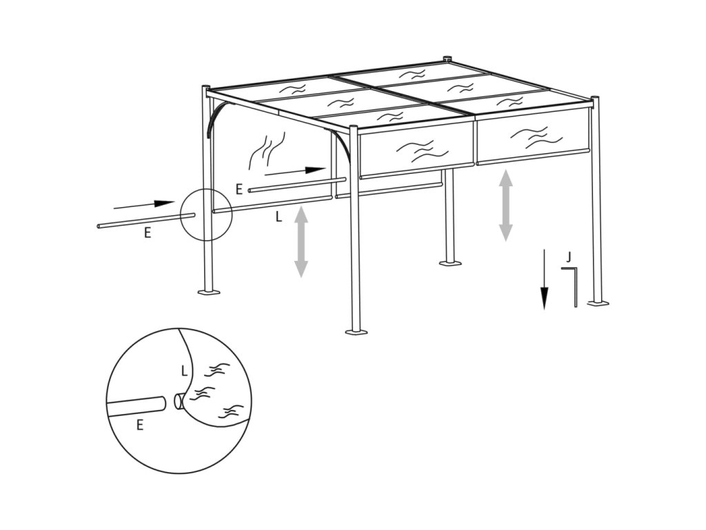Inovativní pergola je opatřená nastavitelnou zasouvací stříškou, kterou lze na obou stranách stáhnout či vytáhnout pomocí vestavěných rukojetí. Sami si tedy můžete určit, kolik dovnitř vpustíte slunečního světla nebo kolik stínu si vytvoříte. Rám pergoly z práškově lakované oceli je velice robustní a odolný. Střecha je ušitá z polyesterové tkaniny potažené vrstvou PA, výborně tudíž vzdoruje vodě i nepřízni počasí. Dá se také sundat, takže pokud ji právě nepoužíváte, můžete ji oprat nebo uskladnit. Zemní kolíky jsou součástí balení.