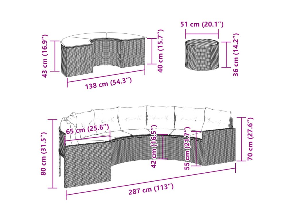 Tato půlkruhová zahradní sedací souprava je dokonalým doplňkem vaší zahrady, terasy nebo dvorku a poskytne vám pohodlné a příjemné místo, kde si můžete povídat s rodinou a přáteli nebo jen tak odpočívat a užívat si pobyt venku.