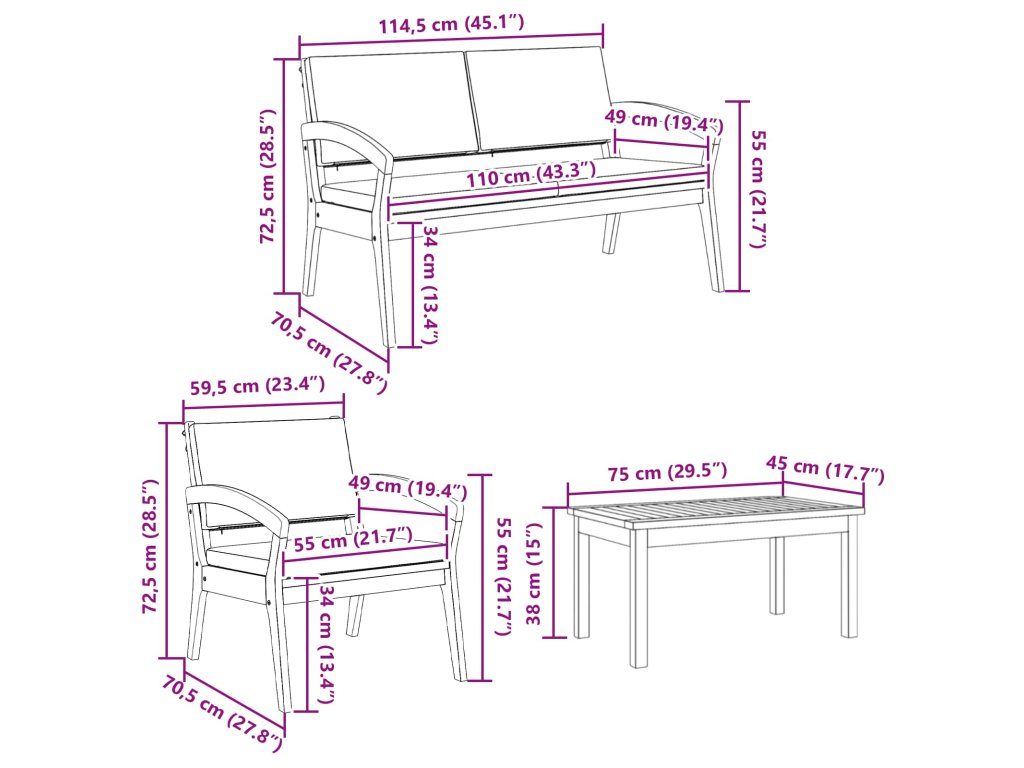 - 2 x Lavice: 114.5 x 70.5 x 72.5 cm (D x Š x V)