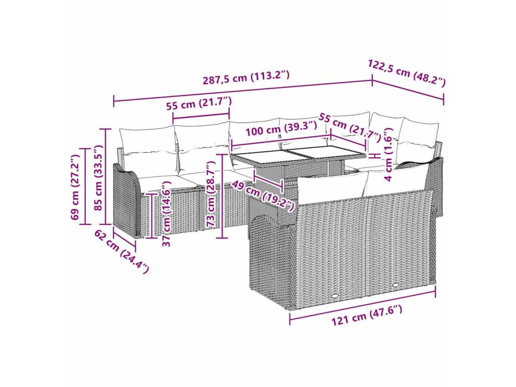 - Součásti: Sada obsahuje stůl z tvrzeného skla pro moderní a odolný povrch, spolu s rohovým sedadlem, středovými sedadly a polstrovanými polštáři, což zajišťuje přizpůsobivost a pohodlí. Každý kus tvoří celkový venkovní zážitek, který nabízí příjemné místo k relaxaci a setkání.