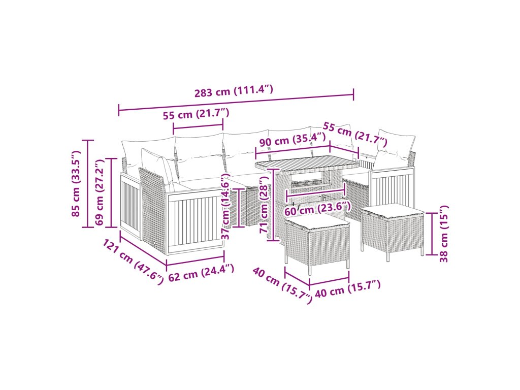 - Materiály: Tato zahradní sedací souprava z poly ratanu spojuje sílu a styl. Poly ratan je odolný a ideální pro venkovní použití, odolává nepříznivému počasí a udržuje si svůj tvar. Masivní akáciové dřevo dodává teplý nádech, což spojuje praktičnost s elegancí.