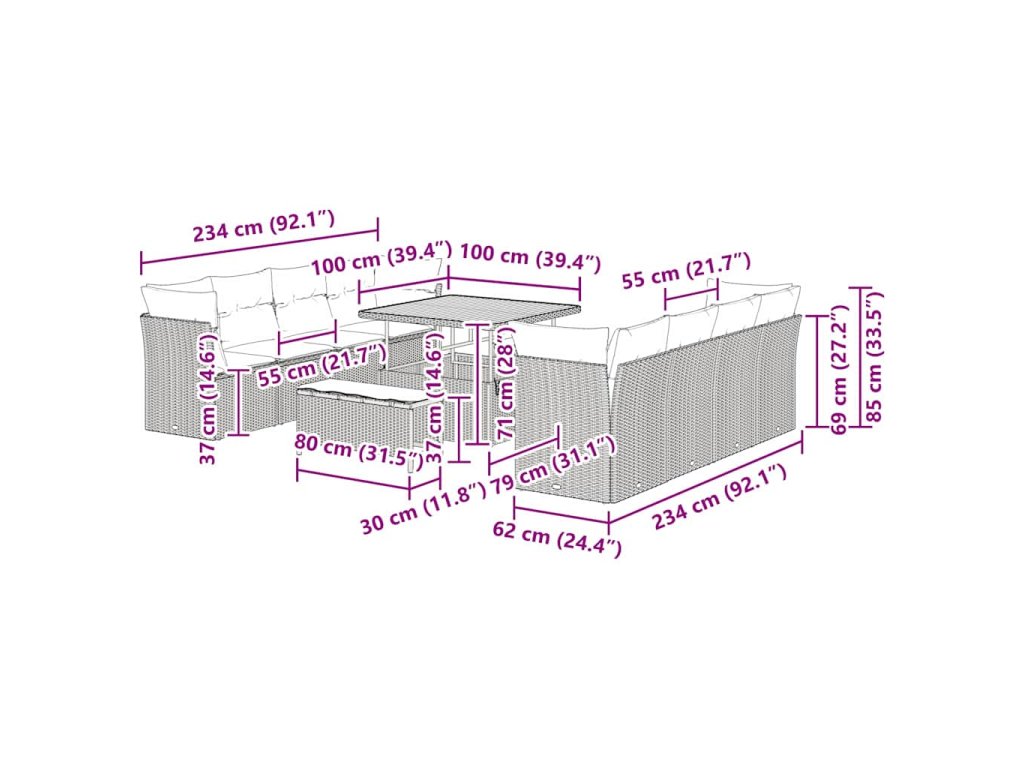 - Kompletní součásti zahradního setu: Tento univerzální set zahrnuje čtyři rohová sedadla, čtyři středová sedadla, dvě stoličky a stůl, což umožňuje velkým shromážděním nebo intimním prostředím. Každý kus je promyšleně navržen pro zvýšení pohodlí a užitečnosti, což poskytuje více uspořádání sedadel pro společenské akce nebo osobní odpočinek.