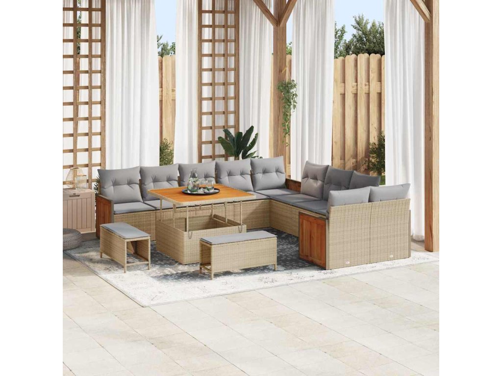 - Materiály: Tato krásná zahradní souprava je vyrobená z poly ratanu a masivního akátového dřeva. Poly ratan je odolný a ideální na ven, a akátové dřevo jí dodává hezký přírodní vzhled.