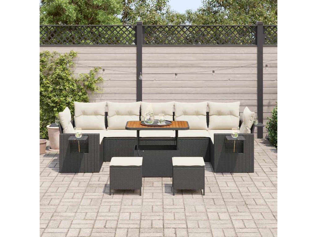 - Kvalitní materiály: Tento set má práškově lakované ocelové rámy, které zaručují stabilitu. Poly ratan a povrch z masivního akáciového dřeva dodávají eleganci i odolnost. Tyto materiály odolávají počasí a dělají z tohoto sofa setu skvělý kousek na ven.