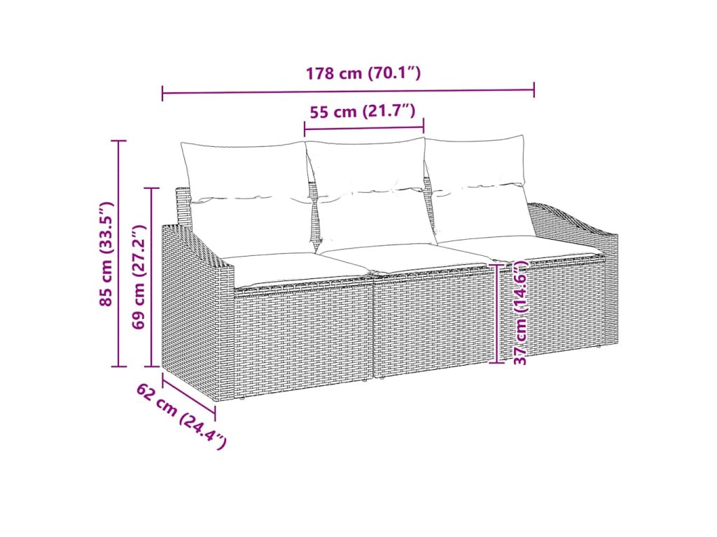 - Komplexní komponenty: Sada se skládá ze střední sedačky, dvou opěrných pohovek a pohodlných polstrů. Důmyslně zpracovaný poly ratan na zadních a opěrných stranách vytváří ucelený vzhled, zatímco práškově lakovaná ocelová konstrukce dodává stabilitu a dlouhou životnost.