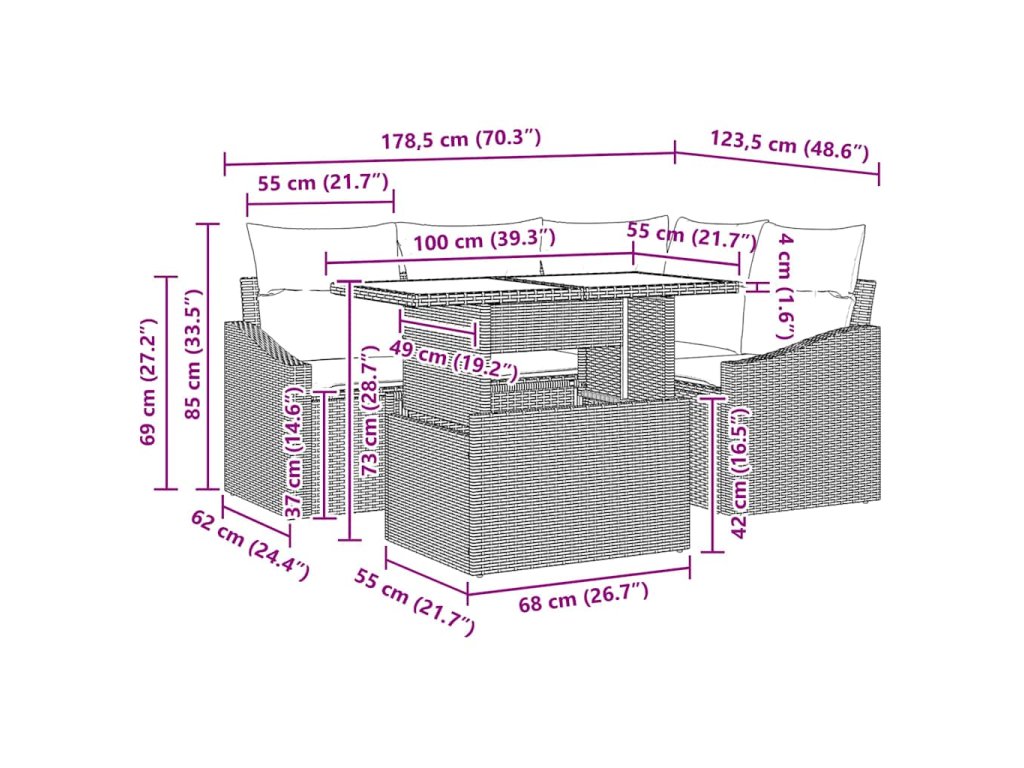 - Součásti: V setu najdete rohové sedátko, středové sedátko, dvě pohovky s opěrkami a stůl, všechny navržené pro pohodlné venkovní relaxování. Sedadla mají tenké podložky pro příjemné sezení.
