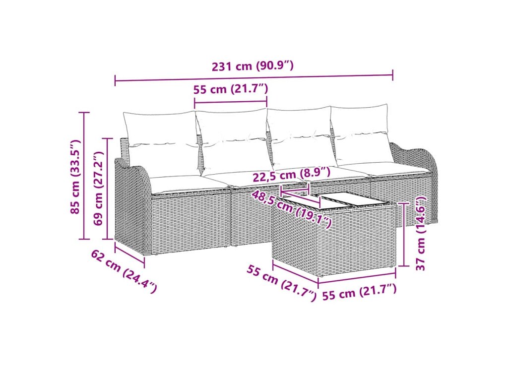 - Zahrnuté komponenty Set obsahuje dvě středové sedačky, dvě arm sofa a stůl, všechno navržené pro pohodlí a hezký design. Opěrky rukou z poly ratanu poskytují skvělou podporu, zatímco polštáře plněné pěnou zabezpečují pohodlné sezení, díky čemuž je každé sezení příjemné.