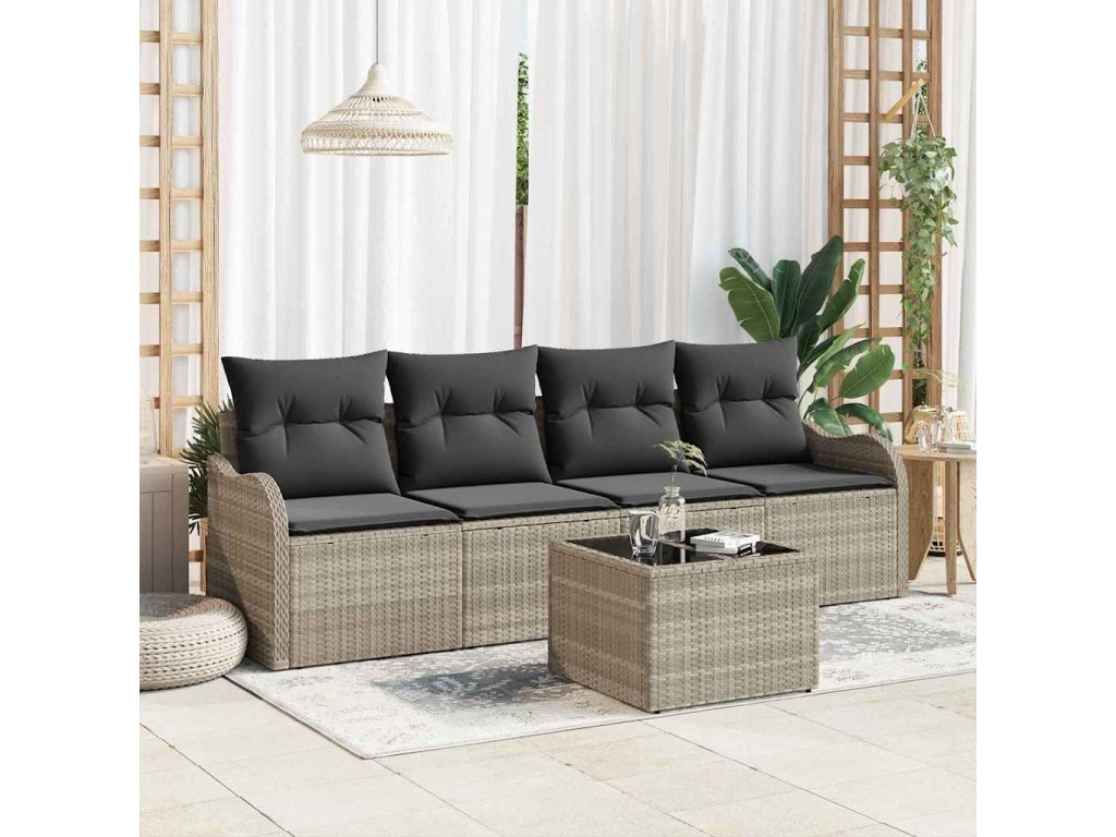 - Výjimečné vlastnosti Díky modulárnímu designu umožňuje tento pohovkový set různá uspořádání podle vašeho prostoru. Materiály odolné proti UV záření chrání set před slunečním poškozením, což zajišťuje, že si zachová svou barvu a funkčnost. Úsporný design s dostatkem úložného prostoru dále vylepšuje uspořádání vaší zahrady.