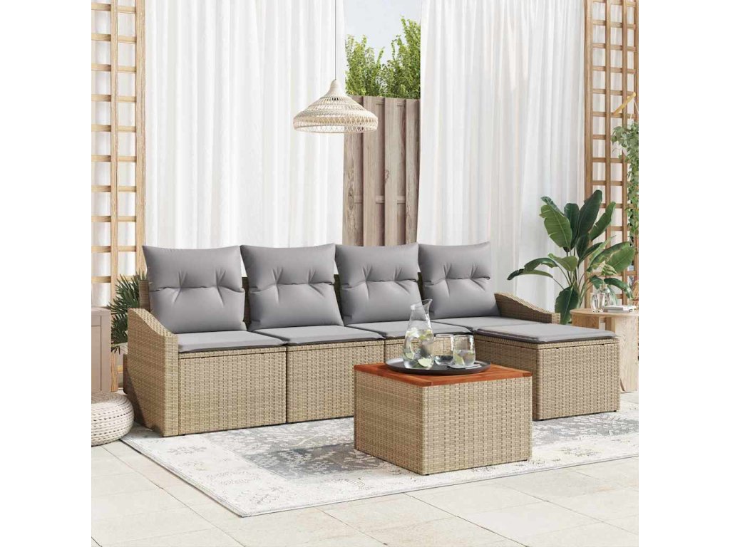 - Prémiové Materiály: Tato zahradní sedací souprava je vyrobena z vysoce kvalitního PE ratanu a práškově lakované oceli, což poskytuje stylový a odolný základ pro venkovní použití. Tkaná textura poly ratanu spojuje estetickou přitažlivost s odolností, zatímco masivní akáciové dřevo zvyšuje její eleganci a odolnost vůči počasí. Tyto materiály zajišťují trvalý výkon proti živlům, vyžadující minimální údržbu.