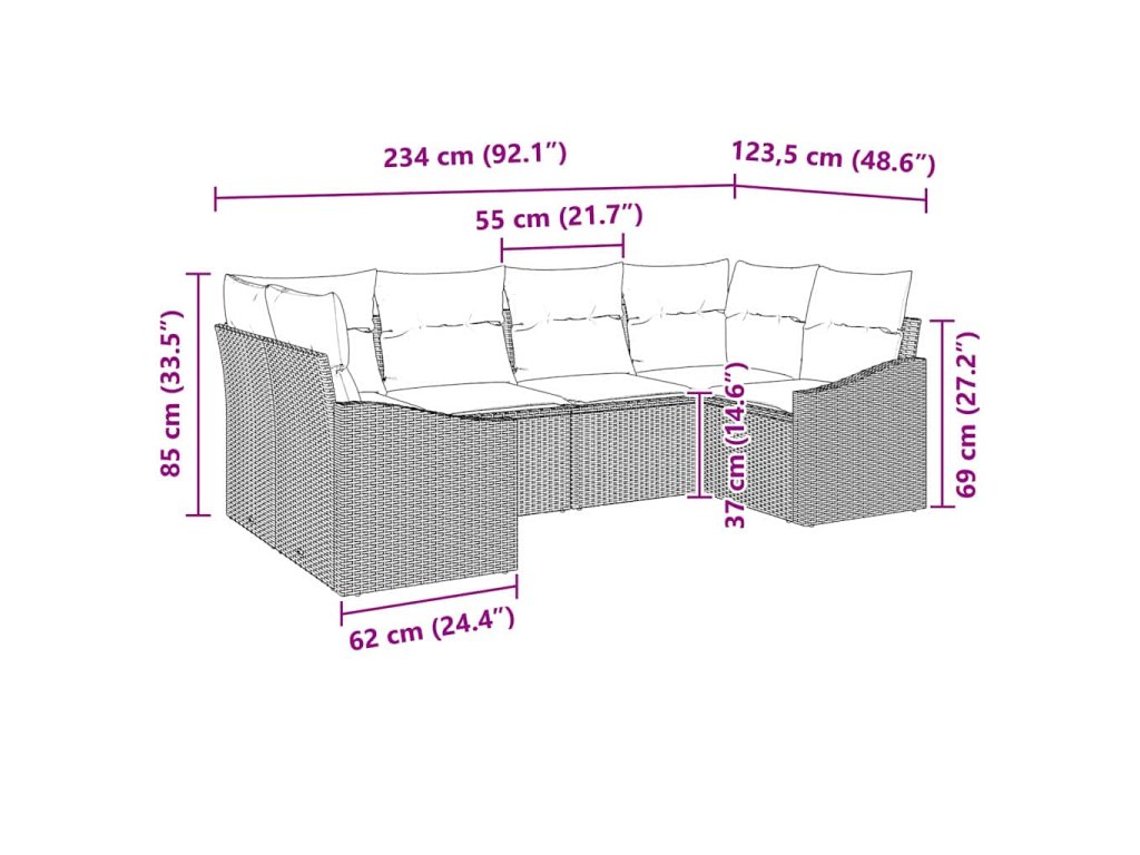 - Součásti sady: Tato sada zahrnuje různé moduly, včetně 2 rohových a 2 středových sedadel, které umožňují řadu uspořádání. Každý modul má esteticky zpracovanou zadní stranu a poly ratanové opěrky pro příjemné posezení.