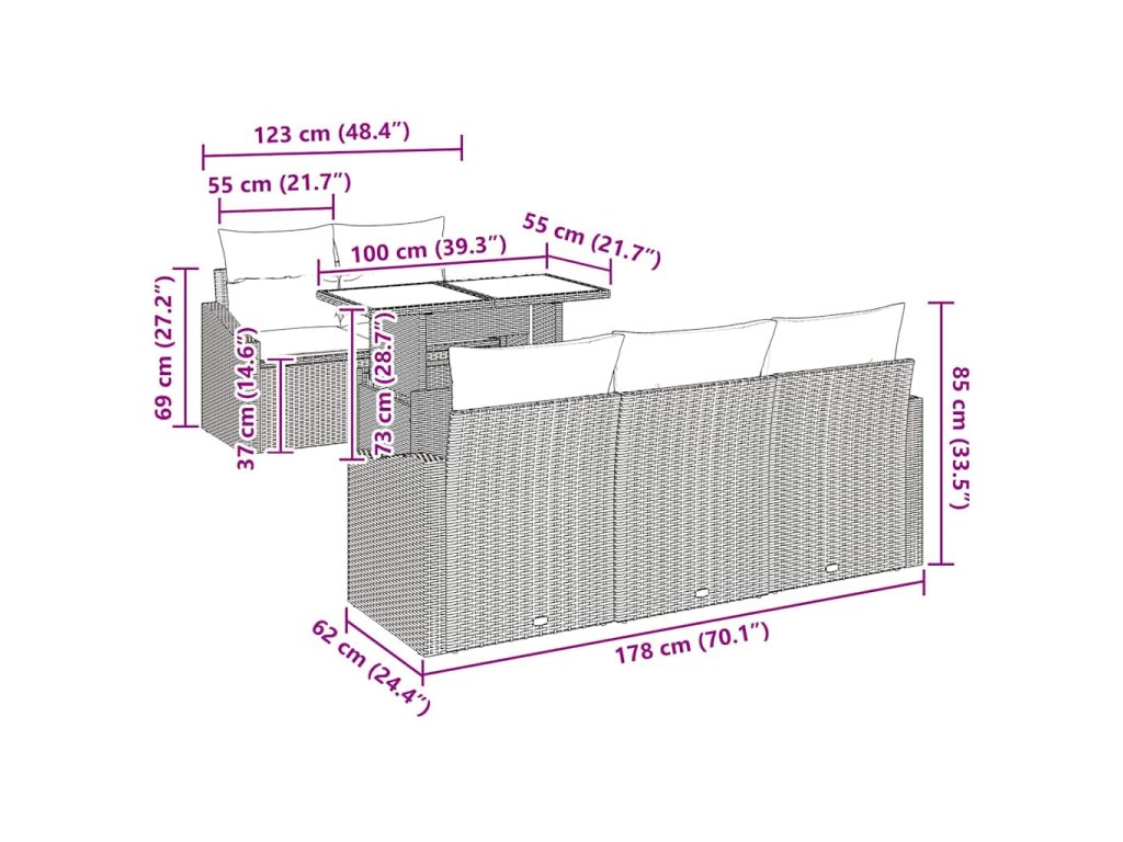 - Složky a díly Tento set zahrnuje centrální sedák, arm sofa a stůl, všechny s odolnými ocelovými rámy pro větší trvanlivost. Opěrky a područky jsou potaženy poly ratanem, což zaručuje pohodlné sezení, zatímco polštáře s pěnou a polyesterem přidávají na komfortu.