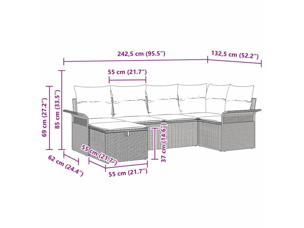 - Celkové rozměry: 242,5 x 132,5 x 85 cm (D x Š x V)
