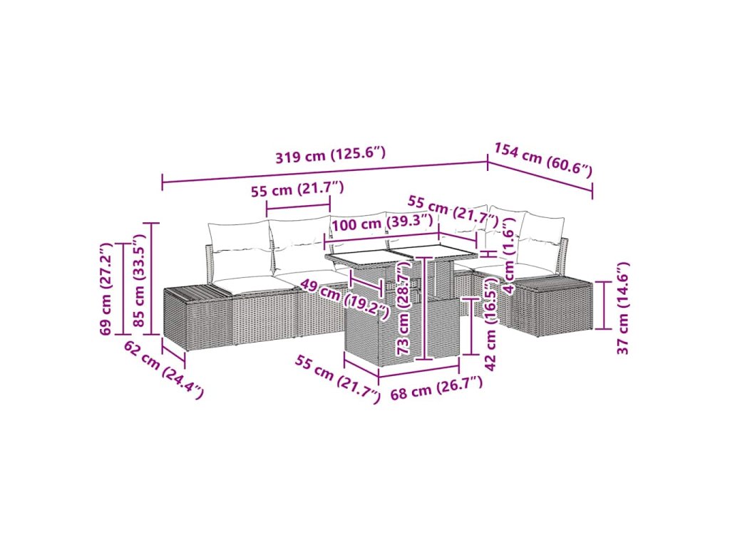 - Materiály: S poly ratanem, tato pohovková souprava spojuje odolnost a moderní vzhled, což z ní dělá ideální volbu pro různá venkovní počasí. Rám z práškově lakované oceli dodává stabilitu, zatímco tvrzená skleněná deska stolu vypadá elegantně.