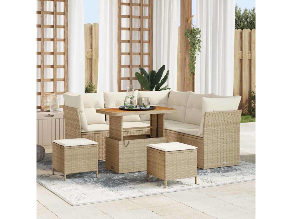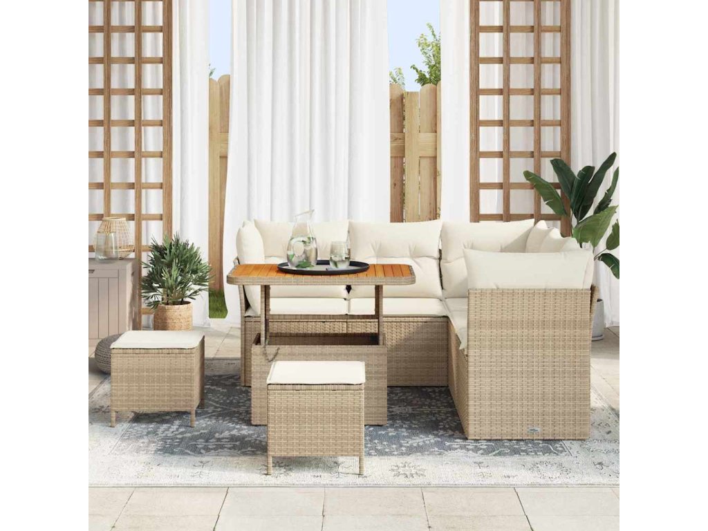 Tato zahradní sada nábytku spojuje moderní jednoduchost s praktičností, což dodává šmrnc tvému venkovnímu prostoru. Je připravená na jakékoliv počasí, kombinuje lesklý ocelový rám s krásou akáciového dřeva a odolného poly ratanu. Čisté linie a jednoduchý styl jí dodávají šmrnc a zajišťují, že je pohodlná. Ideální pro zahrady, terasy nebo patia, tahle sada je skvělá pro lenošení během letních dnů nebo setkání s přáteli, poskytuje dostatek místa k sezení a příjemnou atmosféru.