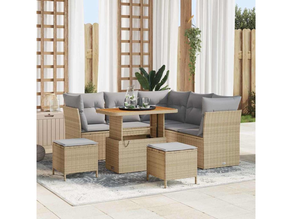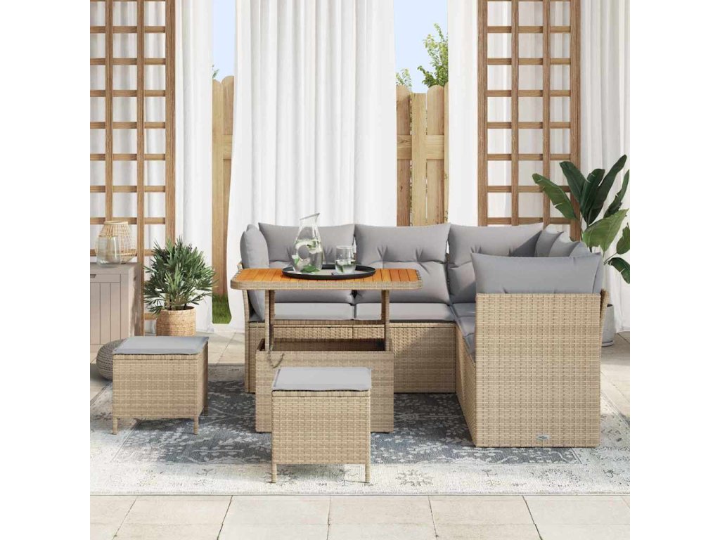 Tato zahradní sada nábytku spojuje moderní jednoduchost s praktičností, což dodává šmrnc tvému venkovnímu prostoru. Je připravená na jakékoliv počasí, kombinuje lesklý ocelový rám s krásou akáciového dřeva a odolného poly ratanu. Čisté linie a jednoduchý styl jí dodávají šmrnc a zajišťují, že je pohodlná. Ideální pro zahrady, terasy nebo patia, tahle sada je skvělá pro lenošení během letních dnů nebo setkání s přáteli, poskytuje dostatek místa k sezení a příjemnou atmosféru.