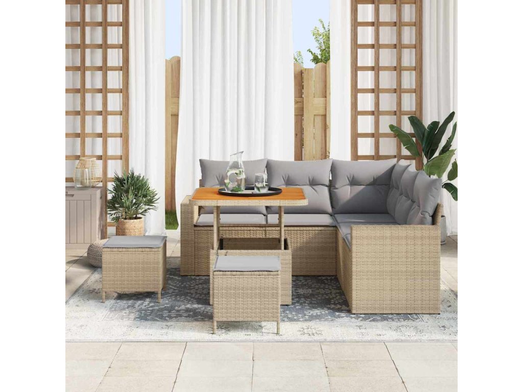 - Materiál Poly Ratan: Vyrobený z odolného poly ratanu, tento moderní pohovkový set přináší elegantní a zároveň odolné vlastnosti, které zajišťují, že odolává venkovním elementům. Tkaná textura nabízí hmatatelný povrch, který zvyšuje estetickou přitažlivost tvé zahrady nebo terasy.