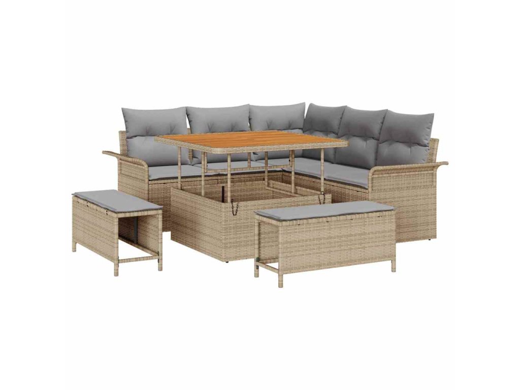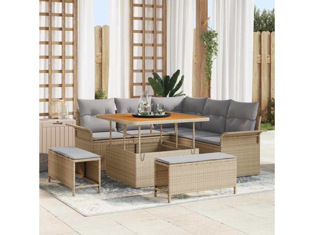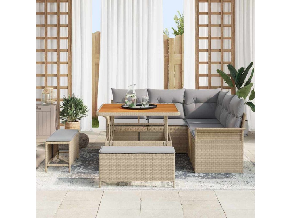 - Složení materiálu: Tento pohovkový set z kvalitního poly ratanu a pevného akátového dřeva spojuje odolnost s elegantním designem. Tyto materiály zajišťují dlouhou životnost a styl, což z něj činí odolný vůči vlivům, přičemž zachovává jak funkčnost, tak nadčasový vzhled.
