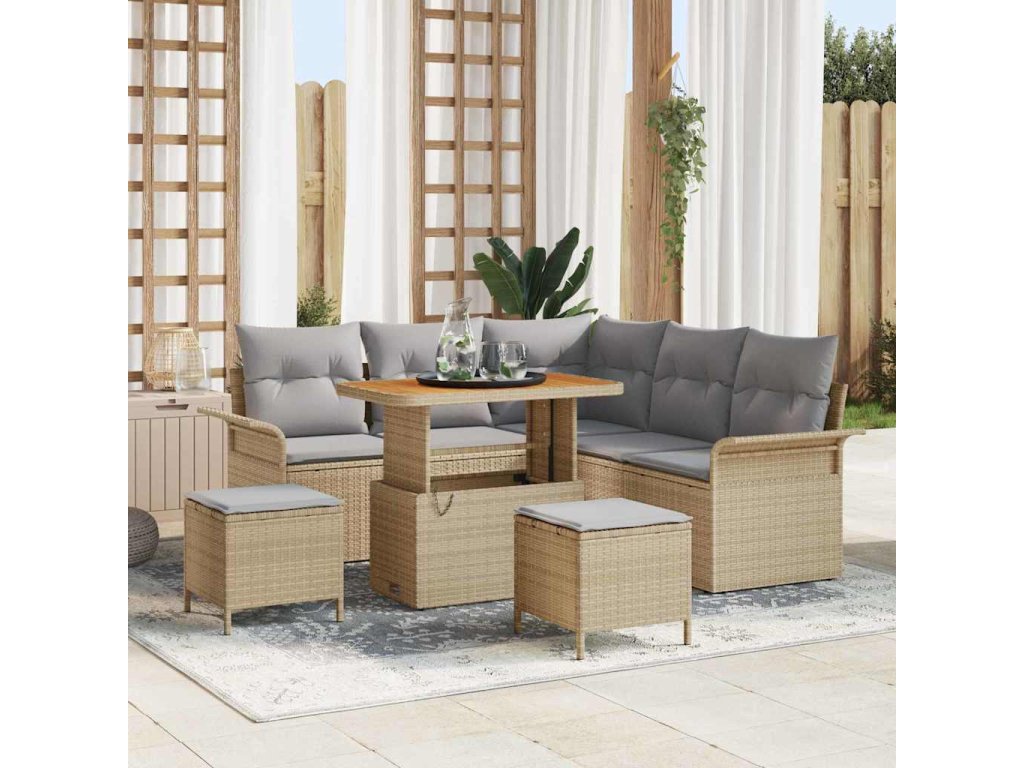 - Složení materiálu: Tento pohovkový set z kvalitního poly ratanu a pevného akátového dřeva spojuje odolnost s elegantním designem. Tyto materiály zajišťují dlouhou životnost a styl, což z něj činí odolný vůči vlivům, přičemž zachovává jak funkčnost, tak nadčasový vzhled.