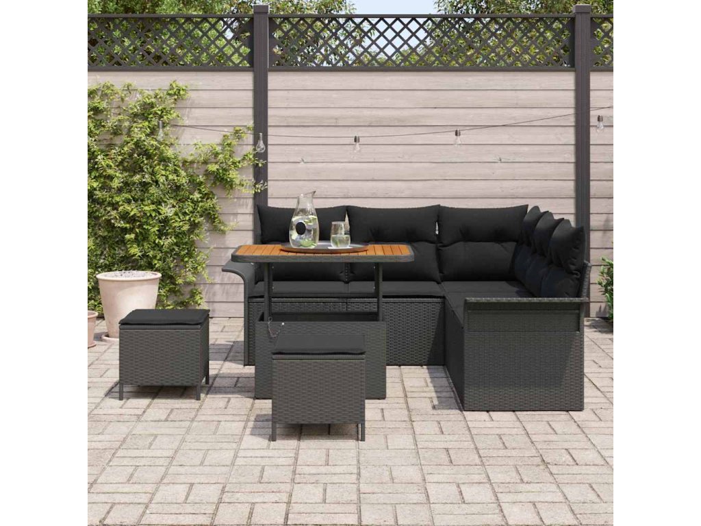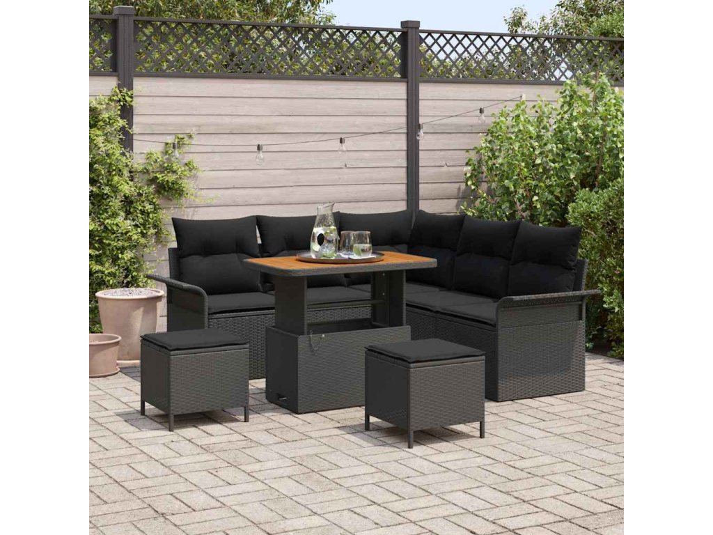 - Složení materiálu: Tento pohovkový set z kvalitního poly ratanu a pevného akátového dřeva spojuje odolnost s elegantním designem. Tyto materiály zajišťují dlouhou životnost a styl, což z něj činí odolný vůči vlivům, přičemž zachovává jak funkčnost, tak nadčasový vzhled.
