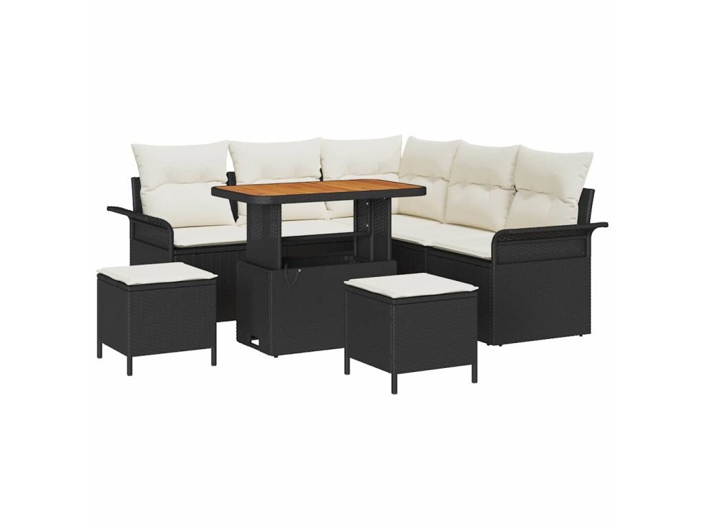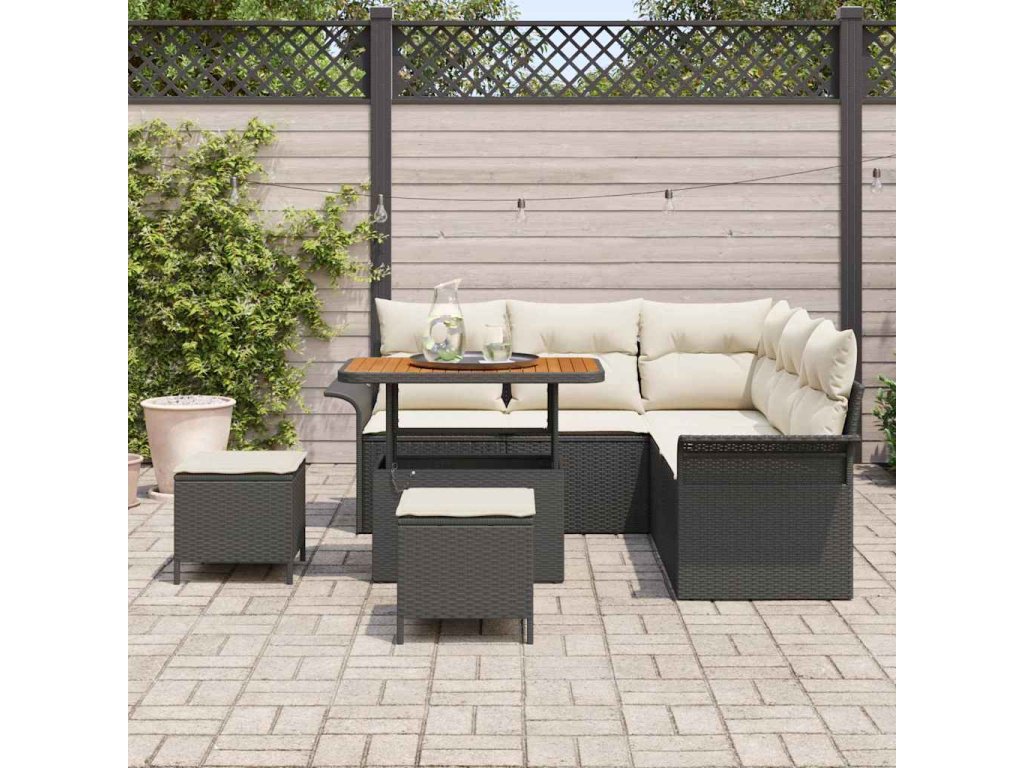 - Složení materiálu: Tento pohovkový set z kvalitního poly ratanu a pevného akátového dřeva spojuje odolnost s elegantním designem. Tyto materiály zajišťují dlouhou životnost a styl, což z něj činí odolný vůči vlivům, přičemž zachovává jak funkčnost, tak nadčasový vzhled.