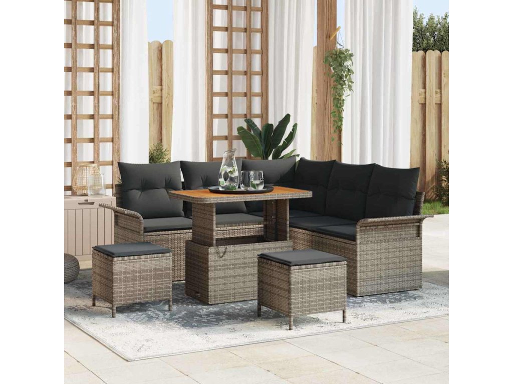 - Složení materiálu: Tento pohovkový set z kvalitního poly ratanu a pevného akátového dřeva spojuje odolnost s elegantním designem. Tyto materiály zajišťují dlouhou životnost a styl, což z něj činí odolný vůči vlivům, přičemž zachovává jak funkčnost, tak nadčasový vzhled.