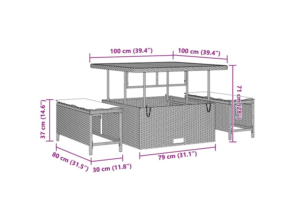 - 1 x Stůl: 100 x 100 x 71 cm (DšxŠxV)