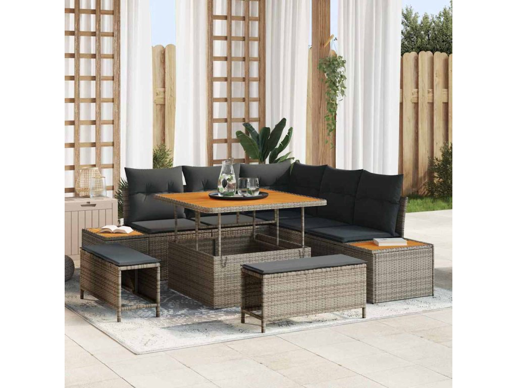 Tato moderní zahradní pohovková sada přináší eleganci a pohodlí do vašich venkovních prostor. S hladkým designem a funkčností je ideální pro hosty nebo poklidné večery. Kombinace odolného poly ratanu a pohodlných pěnových polštářů je perfektní pro váš venkovní odpočinek. Modulární uspořádání umožňuje přizpůsobit set pro jakýkoli dvorek nebo terasu, takže se stane součástí vašich odpočinkových chvil.