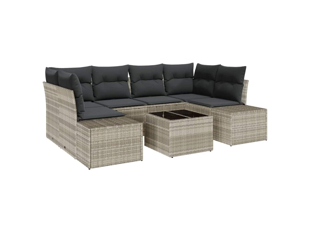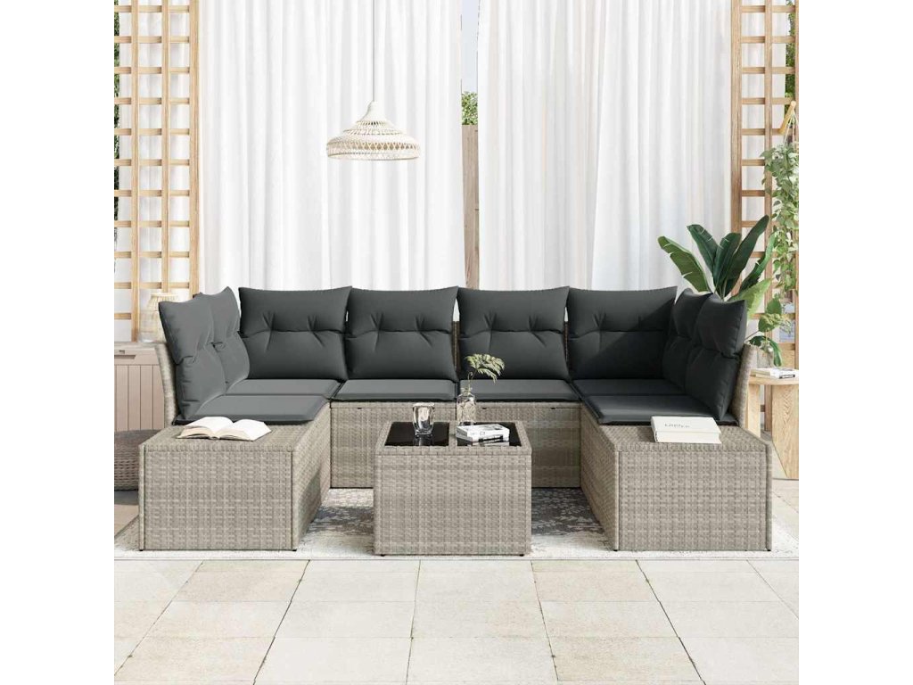 - Odolný rám z polyratanu: Sedací souprava má pevnou konstrukci z polyratanu, která je ideální venku díky odolnosti vůči UV záření a špatnému počasí. Tento materiál zajišťuje, že nábytek si uchová svůj vzhled i funkčnost a je pohodlný díky lehkému polstrování.