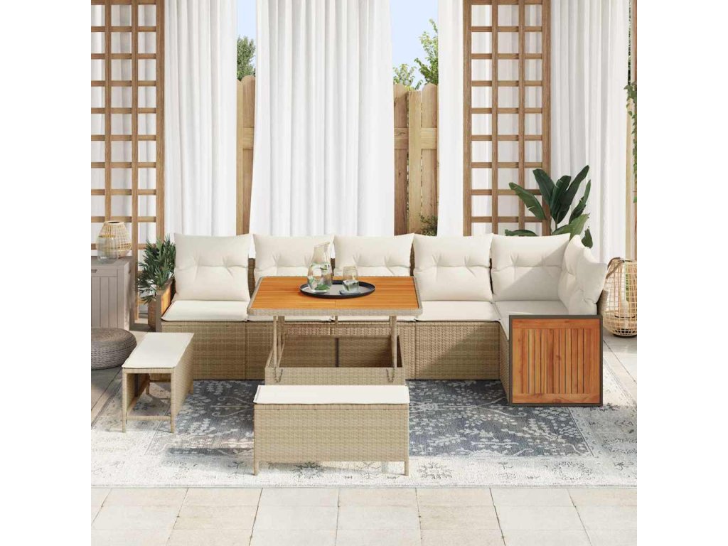- Super Kvalitní Materiály: Pohovkový set je z odolného poly ratanu, který zvládne počasí a dlouho vypadá fajn. Akáciové dřevo mu dodává šmrnc a dělá ho ještě stabilnějším.