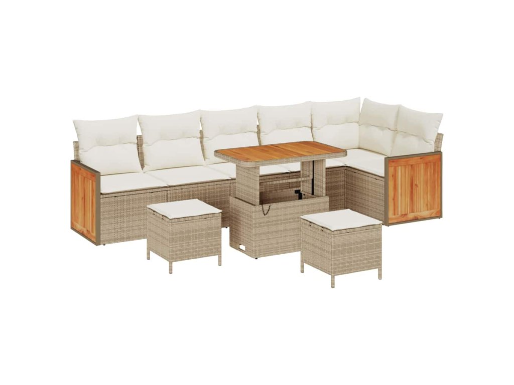 - Super Kvalitní Materiály: Pohovkový set je z odolného poly ratanu, který zvládne počasí a dlouho vypadá fajn. Akáciové dřevo mu dodává šmrnc a dělá ho ještě stabilnějším.