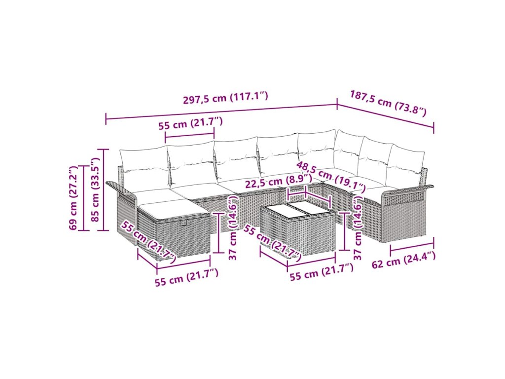 - 8 x zadní polštář: 55 x 55 cm (D x Š)
