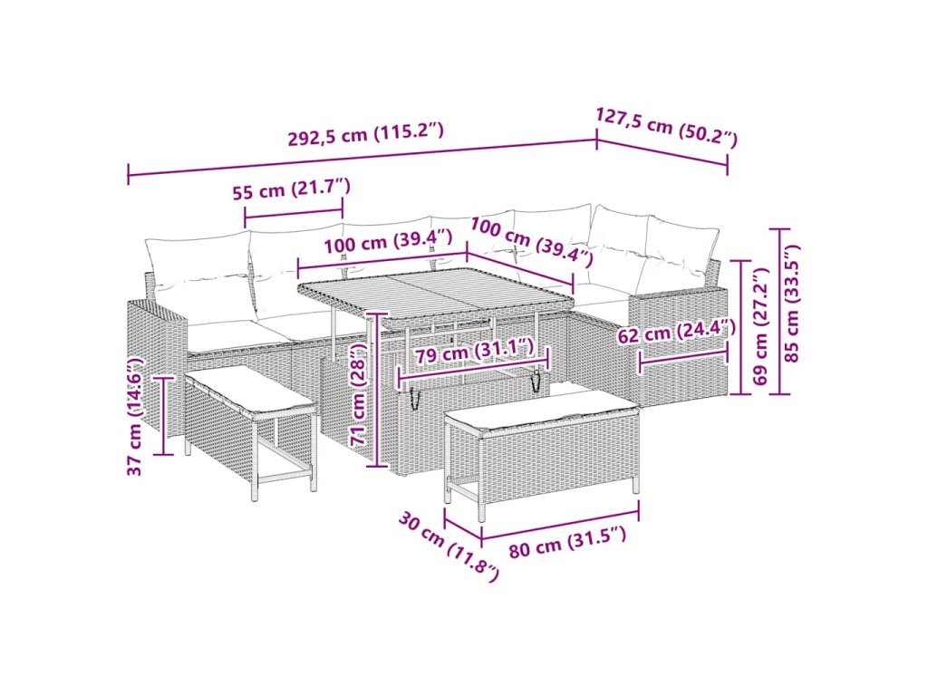 - Víceúčelové funkce: Vybavena výškově nastavitelnou funkcí, sedací souprava vyhovuje různým preferencím sezení a nastavením, čímž zvyšuje použitelnost. Navržena pro venkovní použití, polyratan odolává povětrnostním podmínkám, přičemž uchovává svou integritu a vzhled přes sezóny.