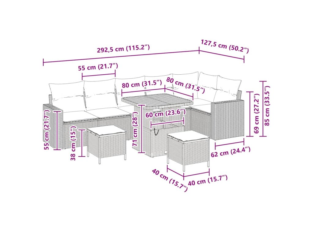 - Víceúčelové funkce: Vybavena výškově nastavitelnou funkcí, sedací souprava vyhovuje různým preferencím sezení a nastavením, čímž zvyšuje použitelnost. Navržena pro venkovní použití, polyratan odolává povětrnostním podmínkám, přičemž uchovává svou integritu a vzhled přes sezóny.
