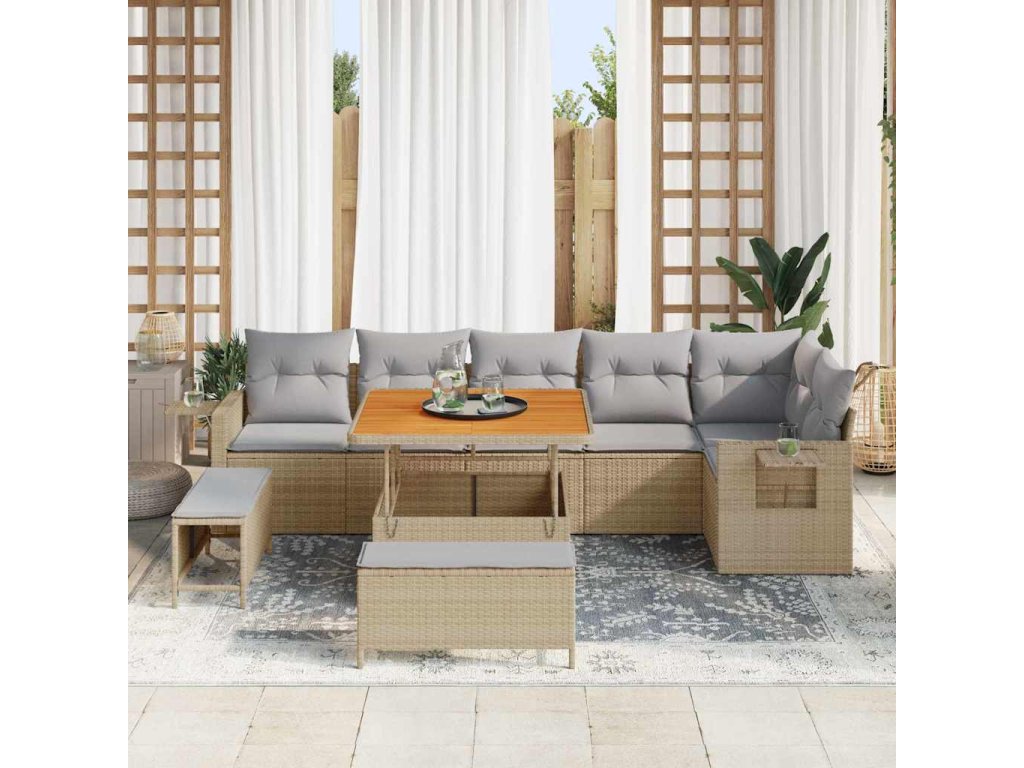 - Poly Ratanová konstrukce—Odolný poly ratan zajišťuje, že set zvládne venkovní použití s elegancí. Spárování s pevním akáciovým dřevem spojuje trvanlivost a styl, takže vypadá skvěle na jakékoli terase nebo zahradě.