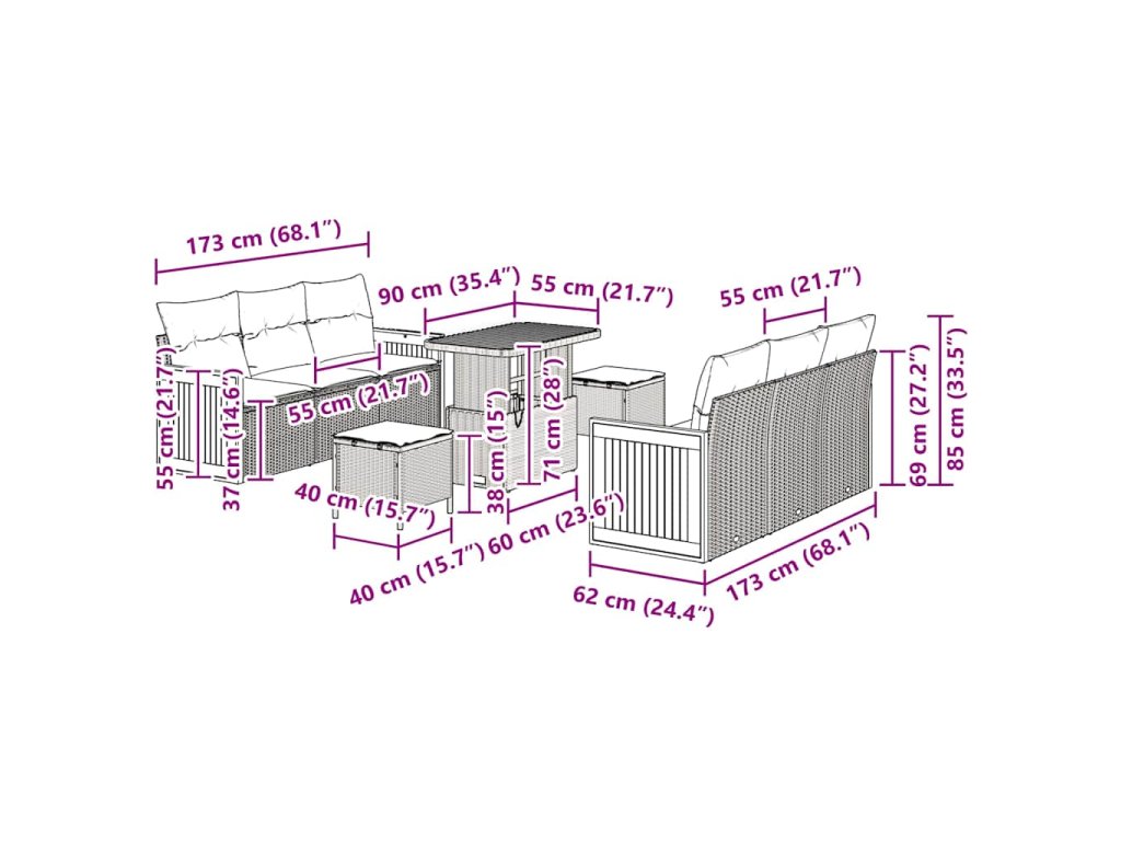 - Úložné řešení: Chytře navržená s úložnými možnostmi, každá pohovka a střední sedák má voděodolné tašky. To pomáhá udržet věci v pořádku, skvělá pro uschování venkovních drobností, aniž bys ztratil styl. Ať už ukládáš sezónní věci nebo osobní předměty, je to fakt praktické.