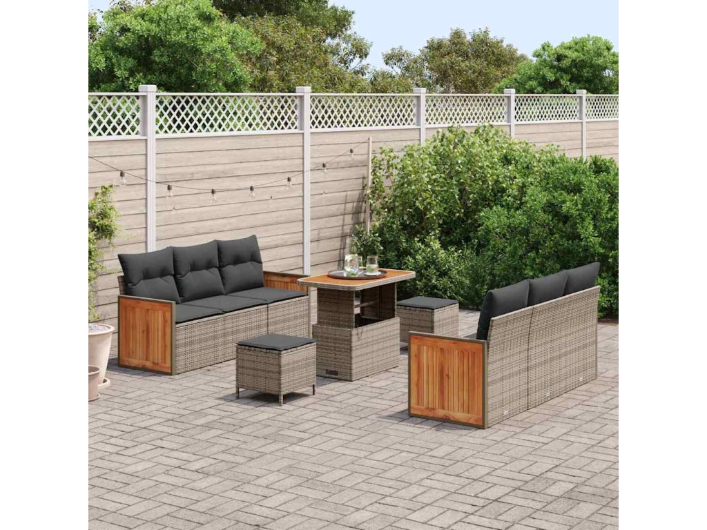 - Materiál: Vyrobeno z kvalitního poly ratanu, tahle moderní sedací souprava je elegantní a odolná, ideální pro život venku. Masivní akáciové dřevo jí dodává příjemný vzhled a spojuje přirozenou krásu s kvalitním zpracováním. Silný ocelový rám zajišťuje další odolnost, takže je připravená na všechny povětrnostní podmínky.