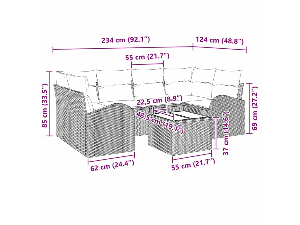- Součásti: Sada obsahuje: dvě rohové sedačky, dvě středové sedačky, dvě pohovky s opěrkami a jeden stůl, všechny s tvrzeným sklem. Konstrukce má ocelové rámy, které zajišťují stabilitu a sílu, zatímco poly ratanové opěradla a loketní opěrky dávají dobrou podporu pro dlouhé sezení.