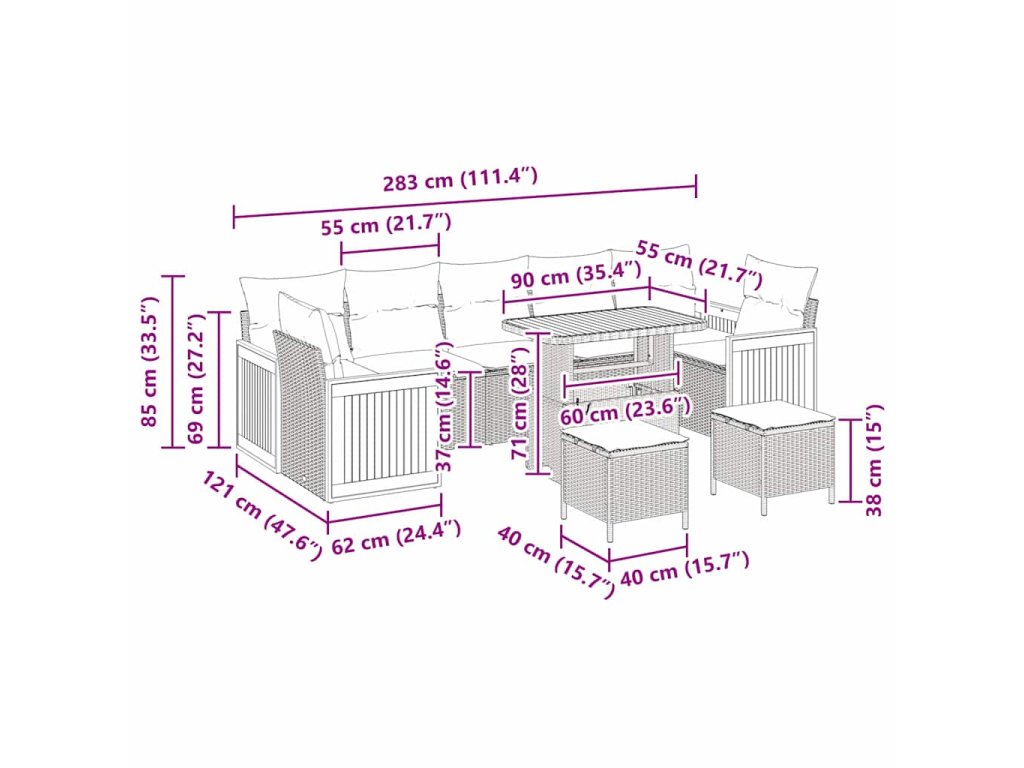 - Funkční komponenty: Díky vestavěnému úložnému prostoru má set armová sofa, středové sedáky a taburety, všechny s praktickým úložným prostorem pod nimi. Tato chytrá funkce pomáhá udržovat tvůj venkovní prostor uklizený a maximálně využitelný.