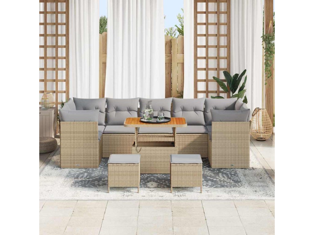Tato modulární zahradní souprava spojuje moderní design s univerzální funkčností, takže váš venkovní prostor bude útulný. Má čisté linie s minimem ozdob, což dává kompaktní vzhled skvělý pro jarní a letní setkání. Odolná konstrukce z poly ratanu a masivního akáciového dřeva zajišťuje, že vydrží nápor počasí. Je ideální pro zahrady a terasy a pomůže vám užít si venkovní zážitky, ať už pořádáte večírek, nebo si chcete jen tak odpočinout.