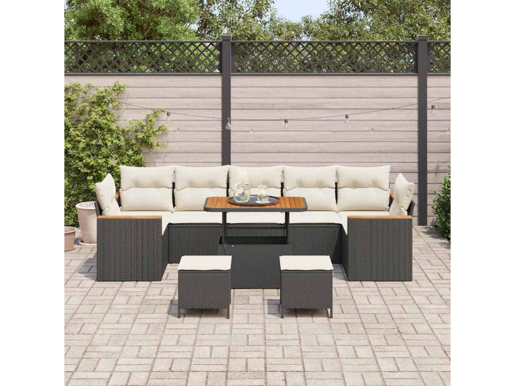- Vysoce kvalitní materiály: Tahle pohovka kombinuje polyratan, co vydrží všechno, s krásným akáciovým dřevem – to vše pro dlouhý venkovní užitek. Povrch stolu z akácie vypadá skvěle a je odolný. Tyto materiály dohromady nabízí skvělou vizuální atraktivitu a užitečnost.